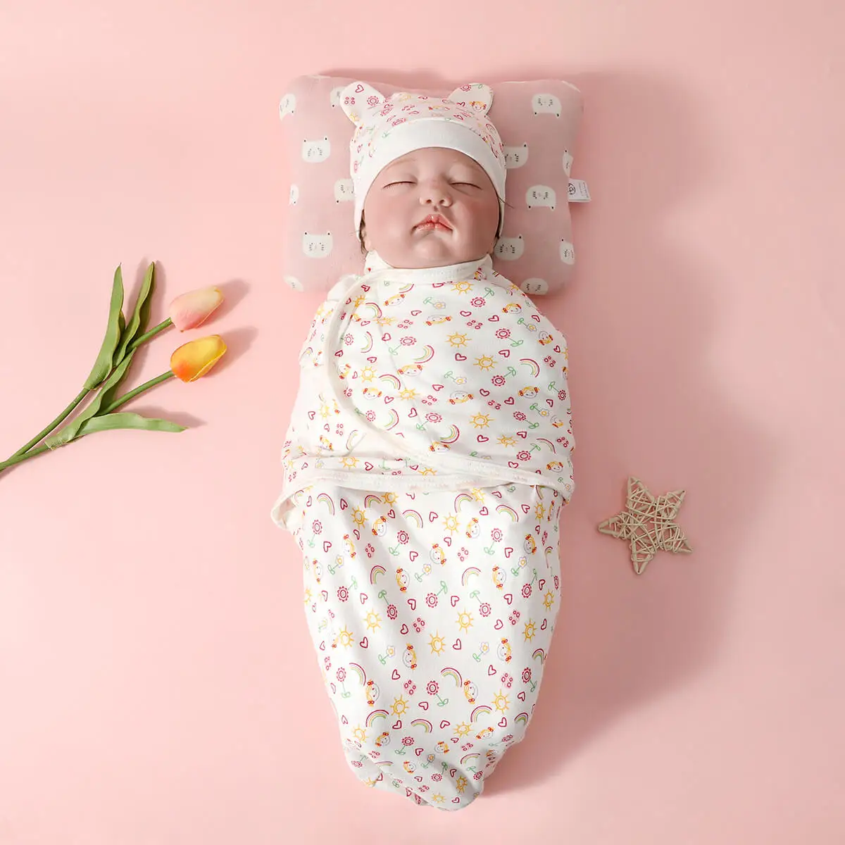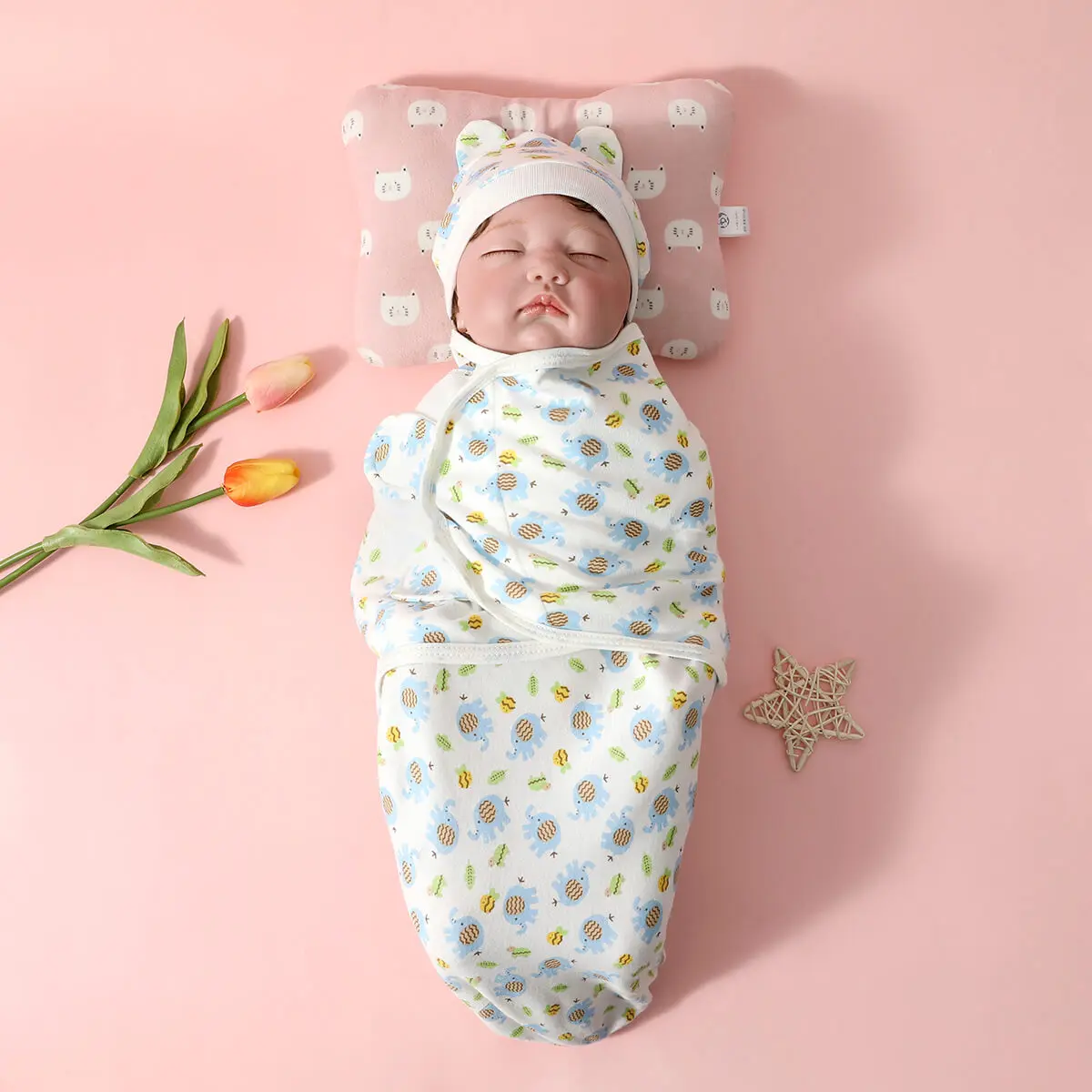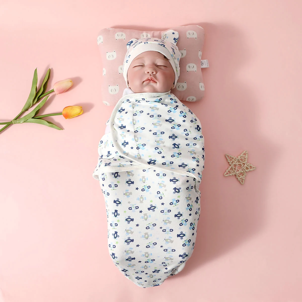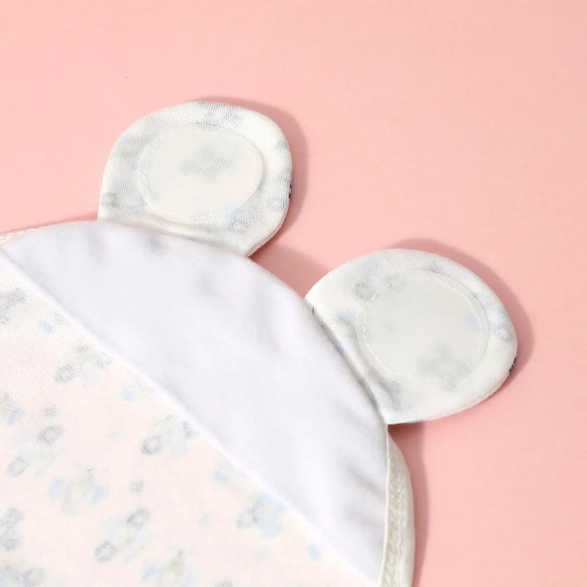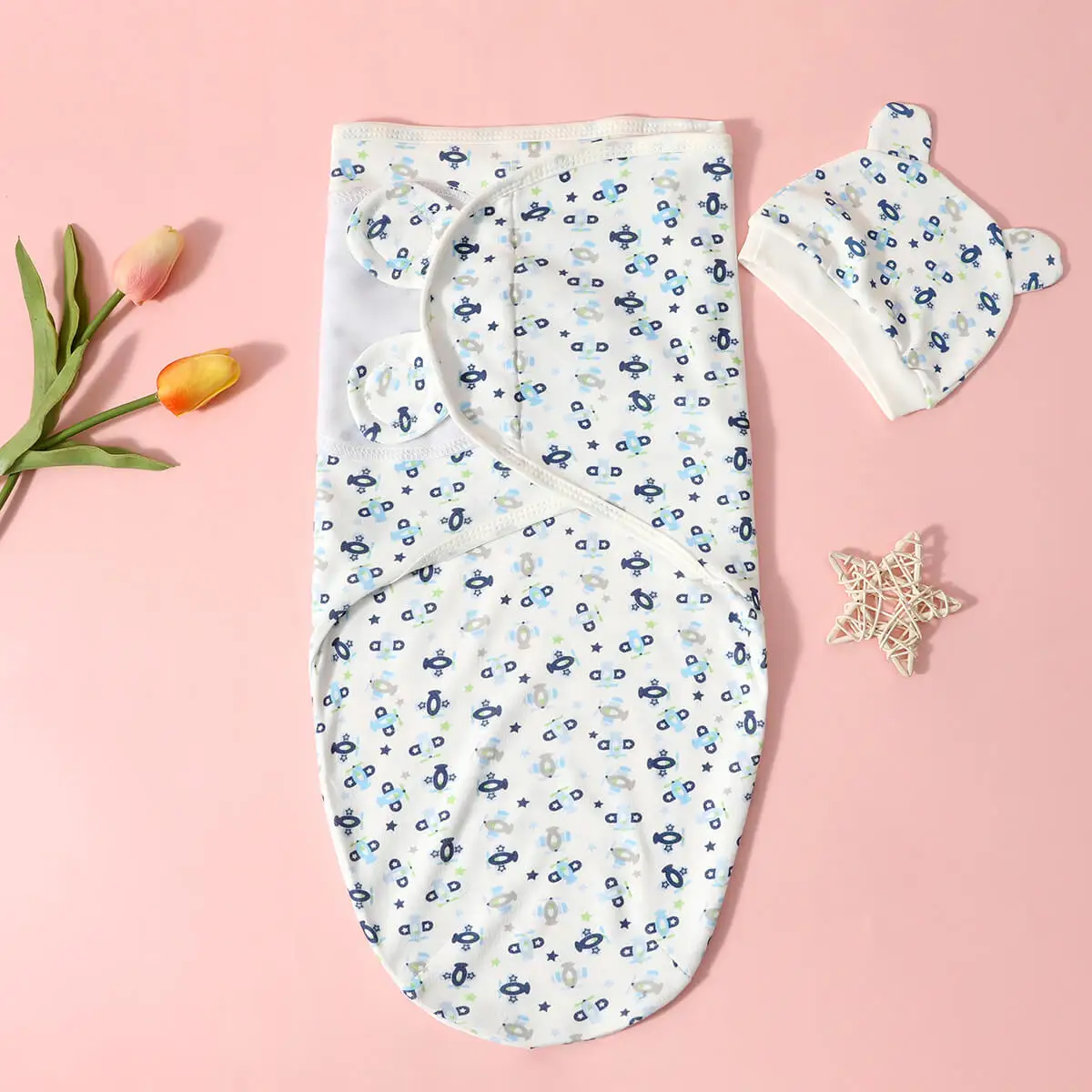 hibobi 2Pcs Cotton Soft Baby Sleeping Cartoon Printed with Bear Ears Hat Design Swaddle Bags for Newborn Infant Wrap Blanket